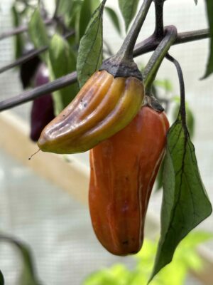 Sie hat eine mittlere Schärfe und einen wunderbaren Geschmack. Die wunderschönen Früchte haben während der Reife einen tollen Farbverlauf. Von violett, über gelb, orange, rot… Am Ende sind sie dann blutrot, wie die Original Count Dracula.
