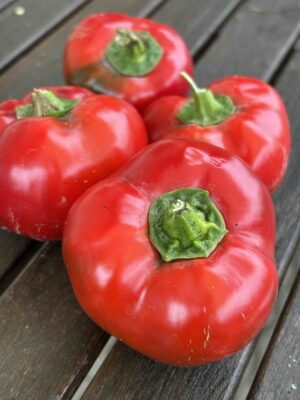 Eine alte Paprikasorte ‘Topepo Rosso’ aus Italien, deren Früchte, die bei Vollreife rot sind und einen Durchmesser von 5 cm haben. Ihr Fleisch ist dick, knackig und sehr lecker. Sie eignen sich hervorragend für Salate und zum Füllen.