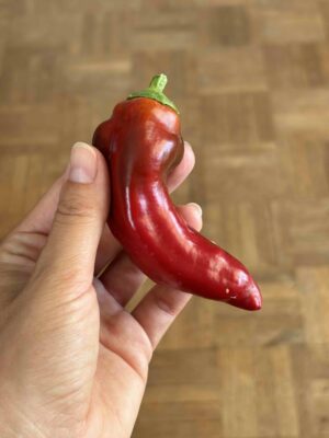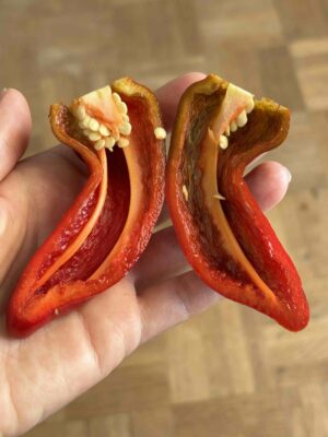 Diese alte Paprikasorte ‘Relleno Rouge’ ist an das kühle Klima angepasst. Es entstehen viele Früchte (15 bis 20 cm gross), die von grün nach rot reifen, mit unterschiedlichen Farben. Sie sind kegelförmig und eignen sich perfekt zum Füllen.